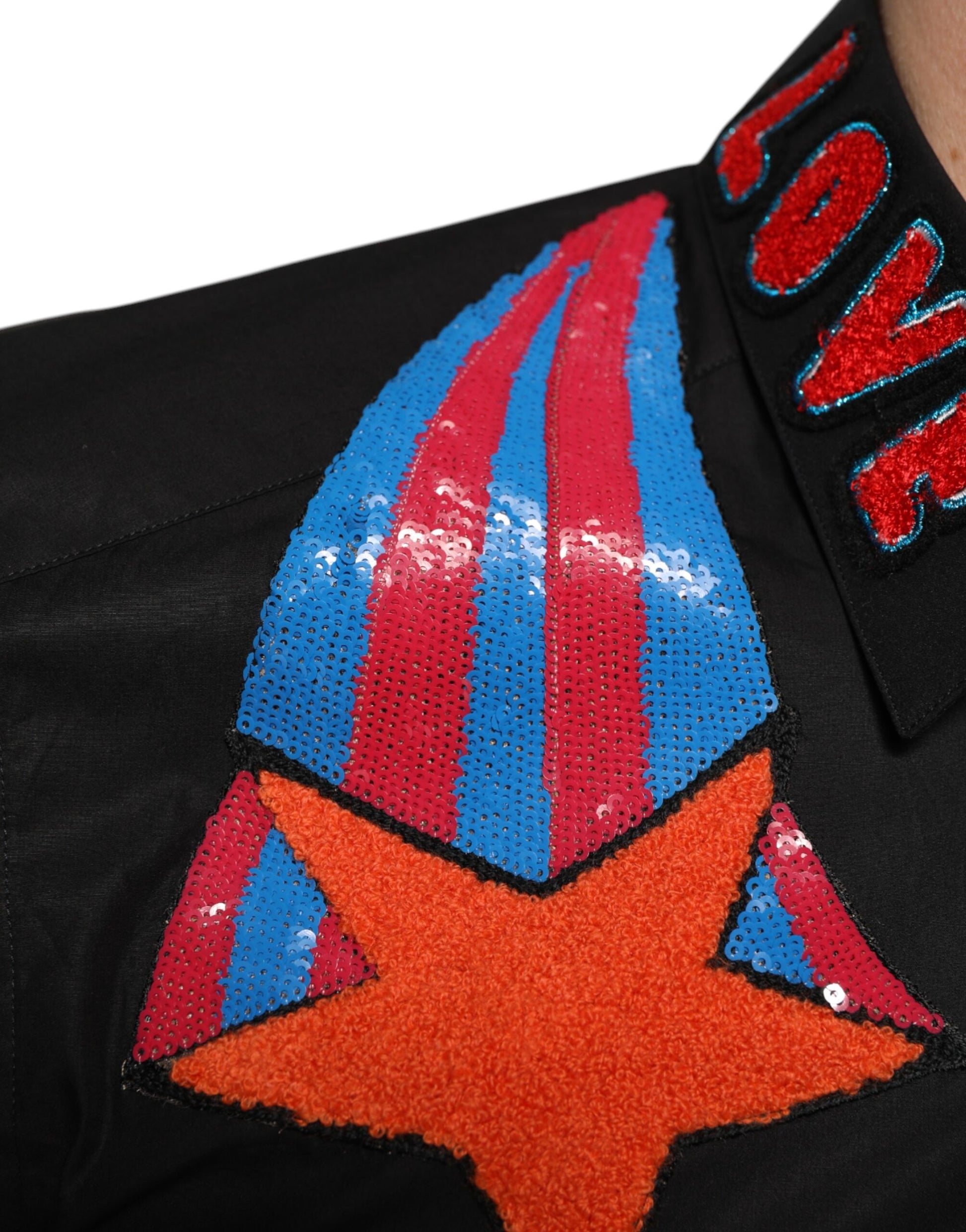Gorgeous brand new, 100% Authentic Dolce & Gabbana black dress shirt for men. Crafted from 100% cotton, this slim fit shirt features a standout embroidered and sequin star patch on the chest and “LOVE” chenille-text detail on the collar. A perfect blend of luxury tailoring and artistic flair.